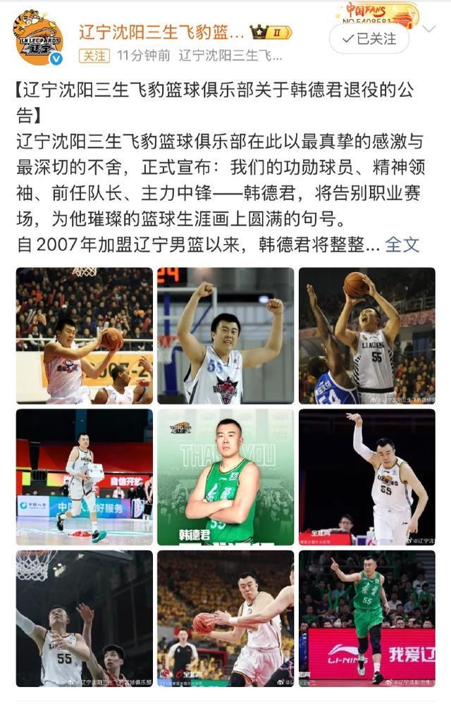 辽宁男篮对韩德君表达了真挚地感谢。他们写道:“回首大韩十八载辉煌岁月,他斩获荣誉无数:CBA历史篮板榜名列前三、六次入选CBA全明星阵容、CBA历史总得分榜高居前十,更是两夺全运会冠军,四次带领辽宁男篮登顶CBA之巅,亲手参与开创了熠熠生辉的“辽篮王朝”。每一滴汗水、每一次拼搏,都镌刻进辽宁体育的光荣史册。谢谢你,大韩!谢谢你十八年如一日地奔跑、坚守、付出!谢谢你将最美好的年华献给了辽篮!谢谢你用奋斗为我们带来那么多激动人心的时刻!也谢谢你始终以低调和真诚,成为中国篮球的正能量榜样!”